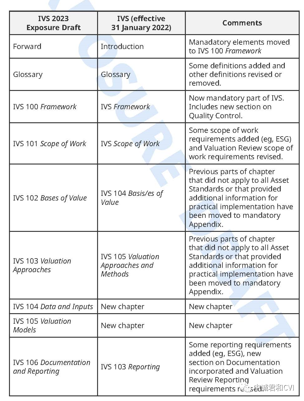 CVI研究认为,IVS自1985年首次发布以来,在近40年的时间内已进行了14次修订,结构、体例和内容已发生重大变化(其中2000年和2011年为重大修订)。2000年以前的IVS受欧美等国评估行业传统的影响,仍是一部以不动产评估为主的准则。2000年以后适应评估行业综合性发展的需求,在保持不动产准则的同时,逐步增加企业价值、无形资产及对应IFRS相关准则的评估规则,但由于定位的问题出现准则内容体系不清、交叉重复内容较多、体系庞大繁琐等问题。2011年以后,IVS重新定位,形成以通用准则(General Standards)和资产准则(Assets Standards)为主要体例的准则体系。本次修订是IVS的每15次修订,总体上延续了2011年以来的结构体例,但在内容上进行了不小的调整。