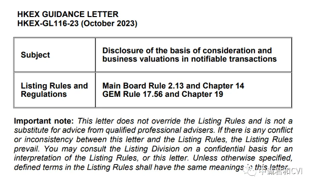 香港联合交易所有限公司(以下简称“联交所”)于2023年10月20日发布了《有关须予公布的交易中代价基准及估值披露问题的指引信》(HKEX-GL116-23,以下简称“指引信”)。